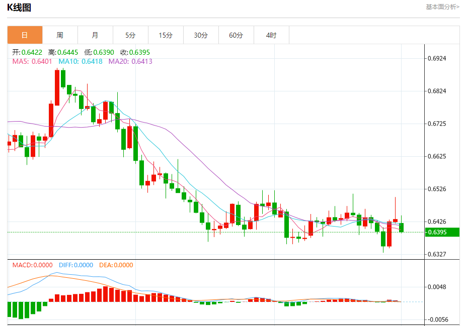今日周一,澳元兑美元报0.6396,跌幅0.59%;美元兑加元报1.3616,涨幅0.34%;美元兑瑞郎报0.9157,涨幅0.04%。 澳元兑美元汇率分析 技术点评:RI技术指标运行趋势复杂,倾向于下跌。 阻力位:0.65000.64750.6445 支撑位:0.63700.63500.6330 美元