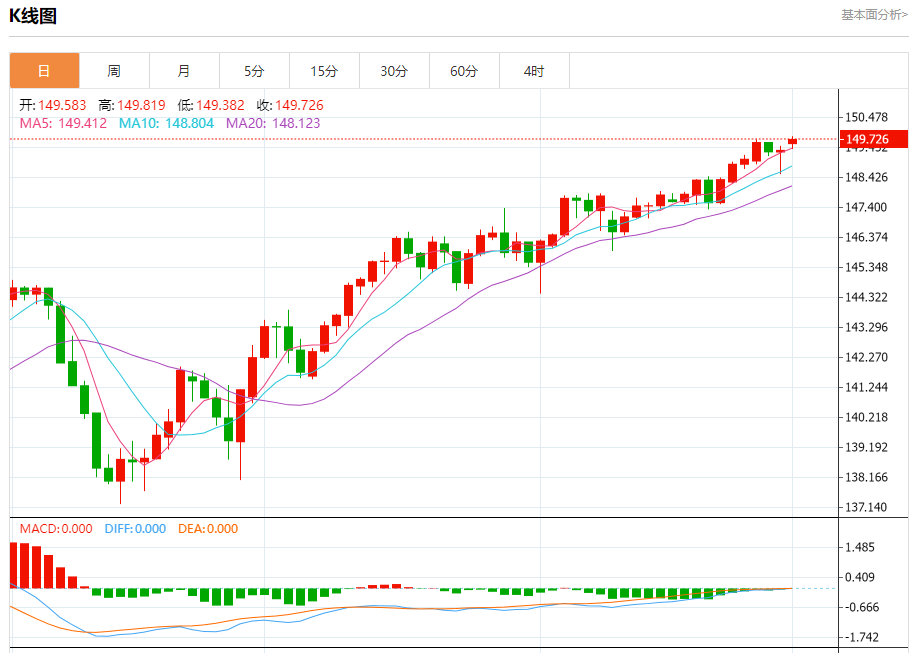 周一盘中,美元/日元报149.750,涨幅0.26%。 今日分析:在149.30之上,看涨,目标价位为150.10,然后为150.40。 技术点评:RI技术指标向上运行。 支撑位:149.30149.00148.65 阻力位:150.65150.40150.10 (亚汇网编辑:冰凡)