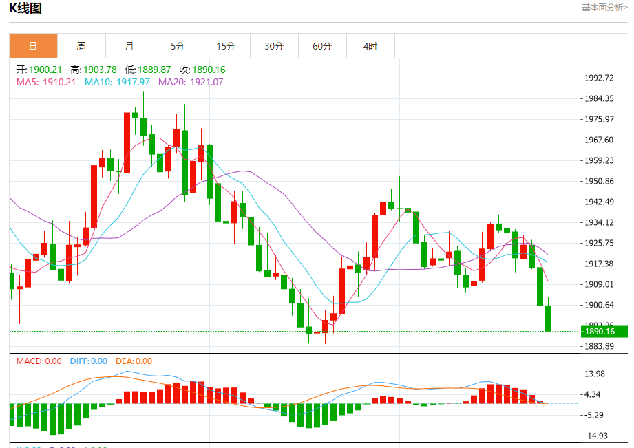 周三盘中,现货黄金报1890.35,跌幅0.53%。 今日分析:在1903.00之下,看跌,目标价位为1888.00,然后为1883.00。 技术点评:RI技术指标看跌,有进一步下降空间。 支撑位:1888.001883.001880.00 阻力位:1915.001910.001903.00 (亚汇网编辑:冰