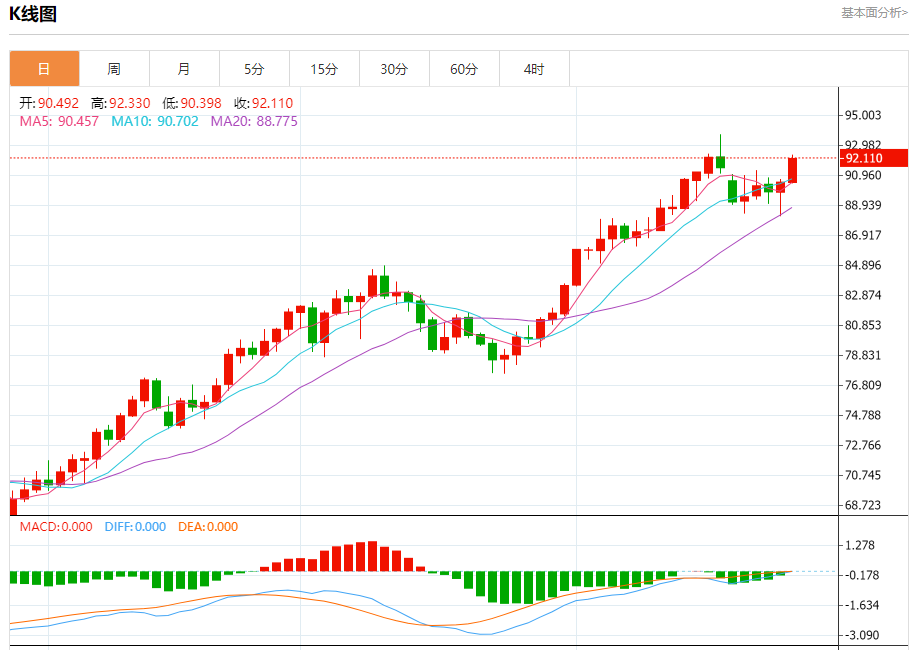 周三盘中,WTI原油报92.289,涨幅1.96%。 今日分析:在91.00之上,看涨,目标价位为91.90,然后为92.50。 技术点评:RI技术指标运行趋势复杂,应谨慎操作。 支撑位:91.0090.7090.30 阻力位:93.1092.5091.90 (亚汇网编辑:冰凡)