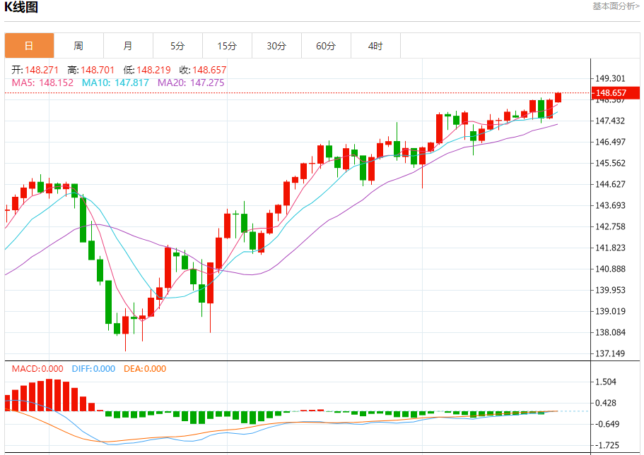 今日周一,截止目前美元兑日元报148.631,上涨0.18%。 日元基本面行情分析 日本央行行长植田和男周一表示,企业是否会继续提高价格和工资存在"非常高的不确定性",再次强调央行维持超宽松货币政策的决心。 植田和男还对海外经济前景提出了谨慎的看法,警告美国大幅加息和中国