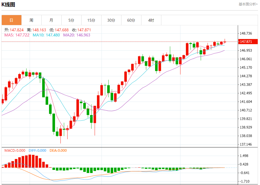 周三盘中,美元/日元报147.823,跌幅0.03%。 今日分析:在148.15之下,看跌,目标价位为147.65,然后为147.50。 技术点评:RI技术指标向下运行。 支撑位:147.65147.50147.30 阻力位:148.45148.25148.15 (亚汇网编辑:冰凡)