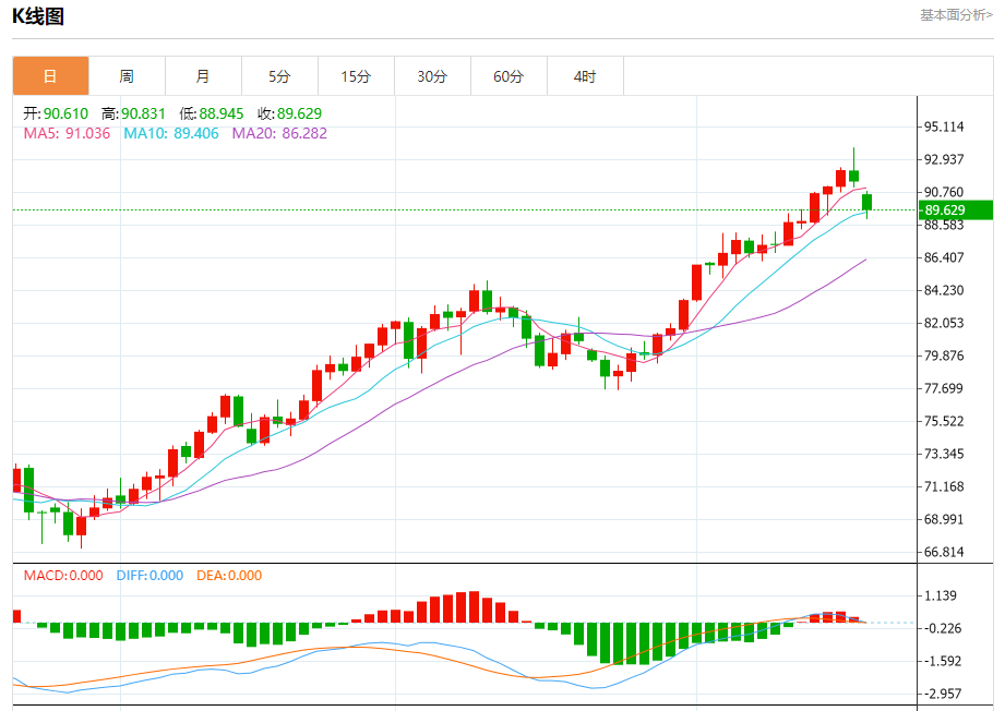 周三盘中,WTI原油报89.711,跌幅1.99%。 今日分析:在90.50之下,看跌,目标价位为88.65,然后为88.20。 技术点评:RI技术指标看跌,有进一步向下趋势。 支撑位:88.6588.2087.65 阻力位:91.9591.2590.50 (亚汇网编辑:冰凡)