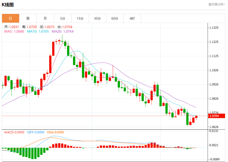 周二晚间,美元指数现报104.917,跌幅0.16%%,现对美元兑欧元、英镑、日元主要货币对分析表述如下: 欧元/美元 汇价高见1.0709,低见1.0675。上一交易日,汇价收于1.0691。 基本面:欧洲央行管委表示,只要抗击通胀的进程有需要,欧洲央行就会把利率保持在4%的水平。这暗示目