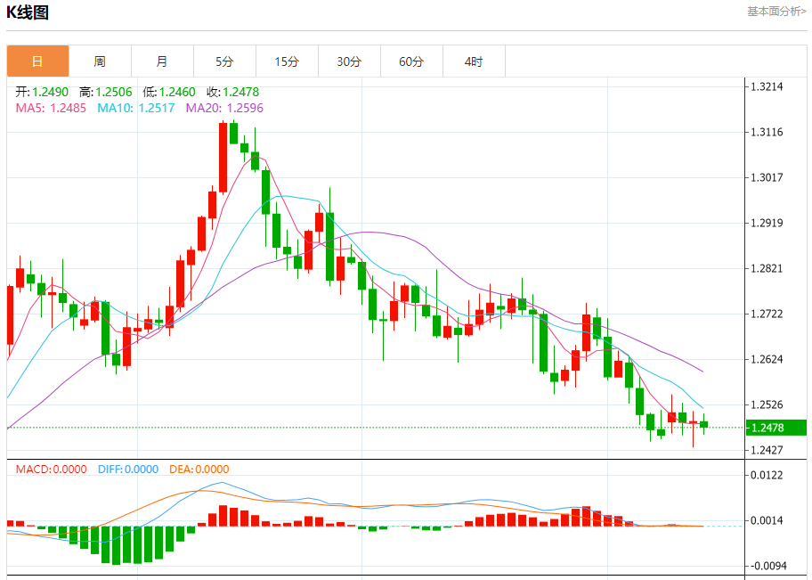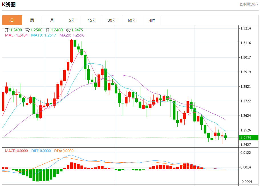 周四盘中,英镑/美元报1.2478,跌幅0.10%。 今日分析:在1.2485之下,看跌,目标价位为1.2455,然后为1.2440。 技术点评:RI技术指标向下运行。 支撑位:1.24551.24401.2430 阻力位:1.25301.25101.2485 (亚汇网编辑:冰凡)