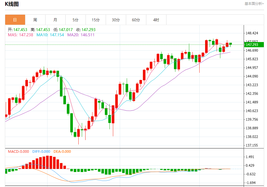 周四盘中,美元/日元报147.400,跌幅0.04%。 今日分析:在147.50之下,看跌,目标价位为147.00,然后为146.80。 技术点评:RI技术指标缺乏上升动能 支撑位:147.00146.80146.60 阻力位:148.00147.80147.50 (亚汇网编辑:冰凡)