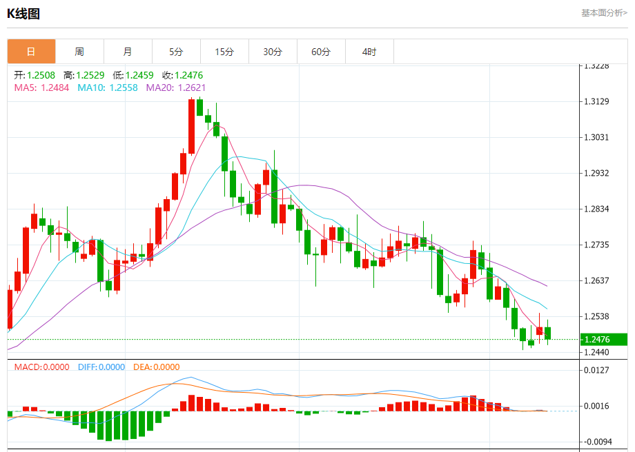 周二盘中,英镑/美元报1.2477,跌幅0.26%。 今日分析:在1.2505之下,看跌,目标价位为1.2450,然后为1.2430。 技术点评:RI技术指标向下运行。 支撑位:1.24501.24301.2400 阻力位:1.25451.25251.2505 (亚汇网编辑:冰凡)