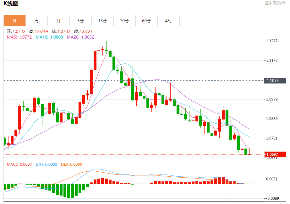 周五晚间,美元指数现报105.060,跌幅0.00%%,现对美元兑欧元、英镑、日元主要货币对分析表述如下: 欧元/美元 汇价高见1.0728,低见1.0694。上一交易日,汇价收于1.0696。 日内建议:可以在1.0750---1.0675的区间下限买入,有效破位40个点止损,目标在区间的上限。