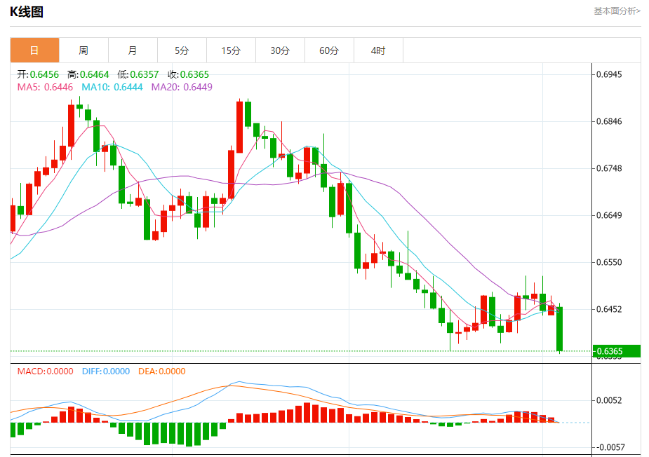 今日周二,澳元兑美元报0.6365,跌幅1.47%;美元兑加元报1.3653,涨幅0.45%;美元兑瑞郎报0.8899,涨幅0.68%。 澳元兑美元汇率分析 技术点评:RI技术指标跌破其30位置。 阻力位:0.64500.64300.6415 支撑位:0.63400.63200.6300 美元兑加元汇率分