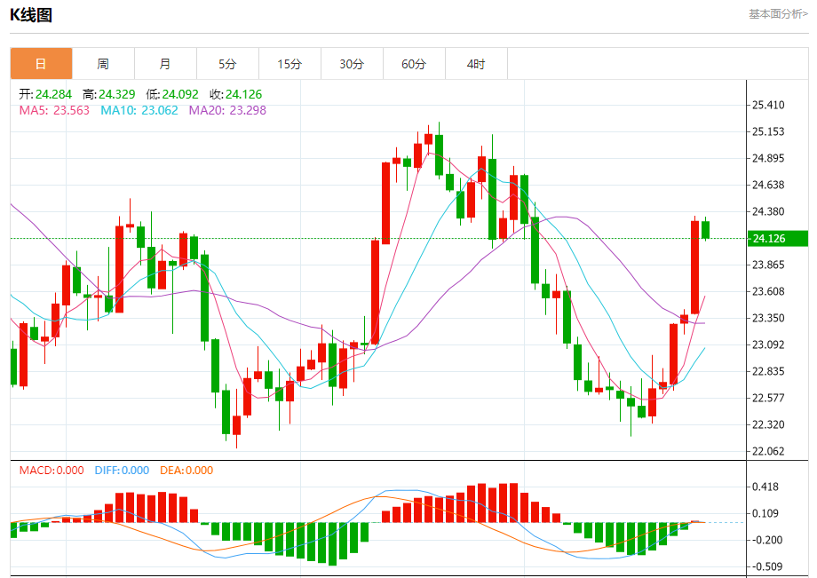 周四盘中,现货白银报24.134,跌幅0.63%。 今日分析:在24.00之上,看涨,目标价位为24.35,然后为24.50。 技术点评:即使我们不能排除持续调整的可能性,其时间长度上,应该是有限的。 支撑位:24.0023.8023.65 阻力位:24.7024.5024.35 (亚汇网