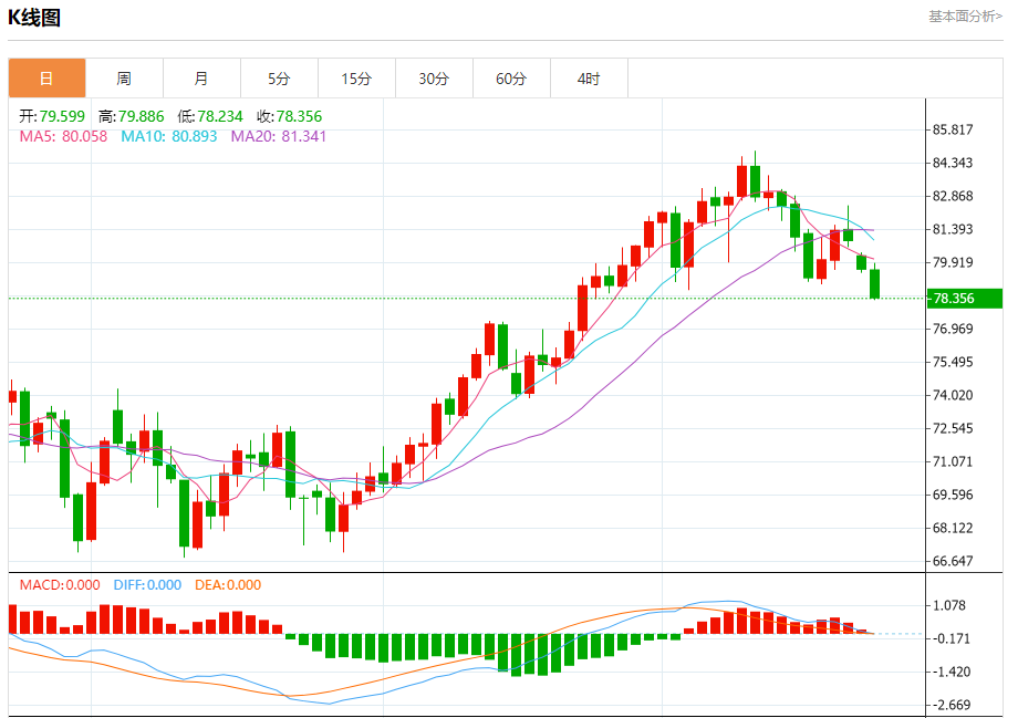 周三盘中,WTI原油报78.248,跌幅1.66%。 今日分析:在79.50之下,看跌,目标价位为78.00,然后为77.40。 技术点评:跌破79.50,为空头信号,向下的目标将会是78.00。 支撑位:78.0077.4077.00 阻力位:80.3079.8579.50 (亚汇网编辑:冰凡)