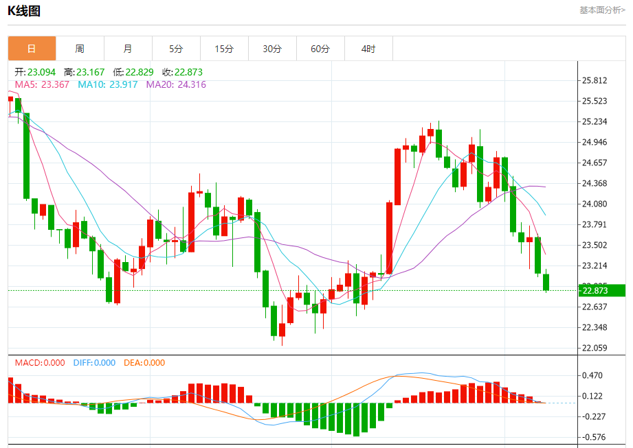周二盘中,现货白银报22.873,跌幅1.03%。 今日分析:在23.35之下,看跌,目标价位为22.90,然后为22.70。 技术点评:只要23.35阻力位不被突破,向下跌破22.90位置的风险很高。 支撑位:22.9022.7022.50 阻力位:23.7823.5723.35 (亚汇网编辑:冰