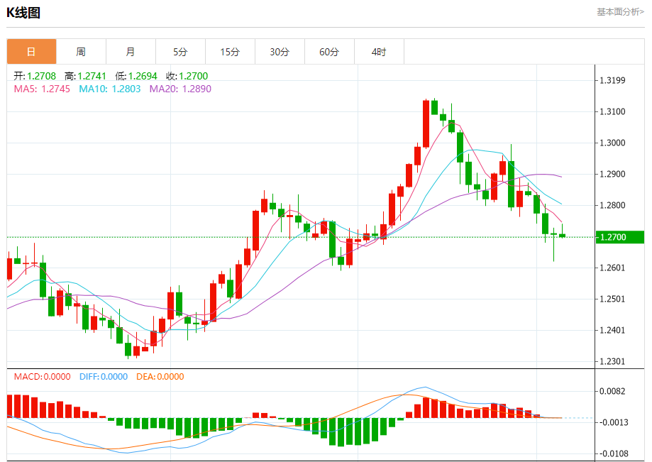 周五盘中,英镑/美元报1.2700,跌幅0.07%。 今日分析:在1.2740之下,看跌,目标价位为1.2675,然后为1.2645。 技术点评:RI技术指标向下运行。 支撑位:1.26751.26451.2620 阻力位:1.27951.27651.2740 (亚汇网编辑:冰凡)
