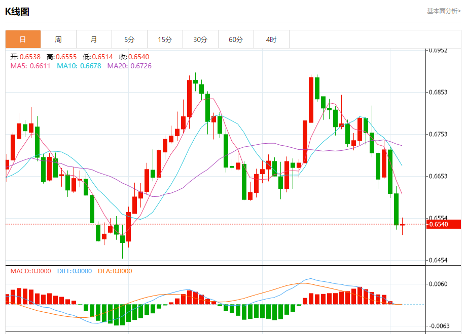 今日周四,澳元兑美元报0.6540,涨幅0.02%;美元兑加元报1.3360,涨幅0.07%;美元兑瑞郎报0.8742,跌幅0.39%。 澳元兑美元汇率分析 技术点评:RI技术指标缺乏上升动能。 阻力位:0.66200.65950.6565 支撑位:0.65000.64800.6460 美元兑加元汇率分