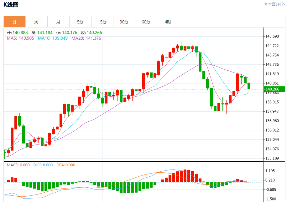 周三盘中,美元/日元报140.267,跌幅0.45%。 今日分析:在140.85之下,看跌,目标价位为140.20,然后为139.75。 技术点评:RI技术指标向下运行。 支撑位:140.20139.75139.35 阻力位:141.40141.20140.85 (亚汇网编辑:冰凡)
