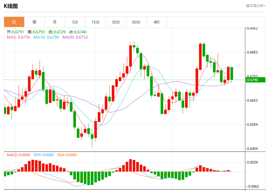 今日周三,澳元兑美元报0.6740,跌幅0.77%;美元兑加元报1.3231,涨幅0.45%;美元兑瑞郎报0.8625,跌幅0.13%。 澳元兑美元汇率分析 技术点评:只要0.6780阻力位不被突破,向下跌破0.6740位置的风险很高。 阻力位:0.68100.67950.6780 支撑位:0.67400.67250.671