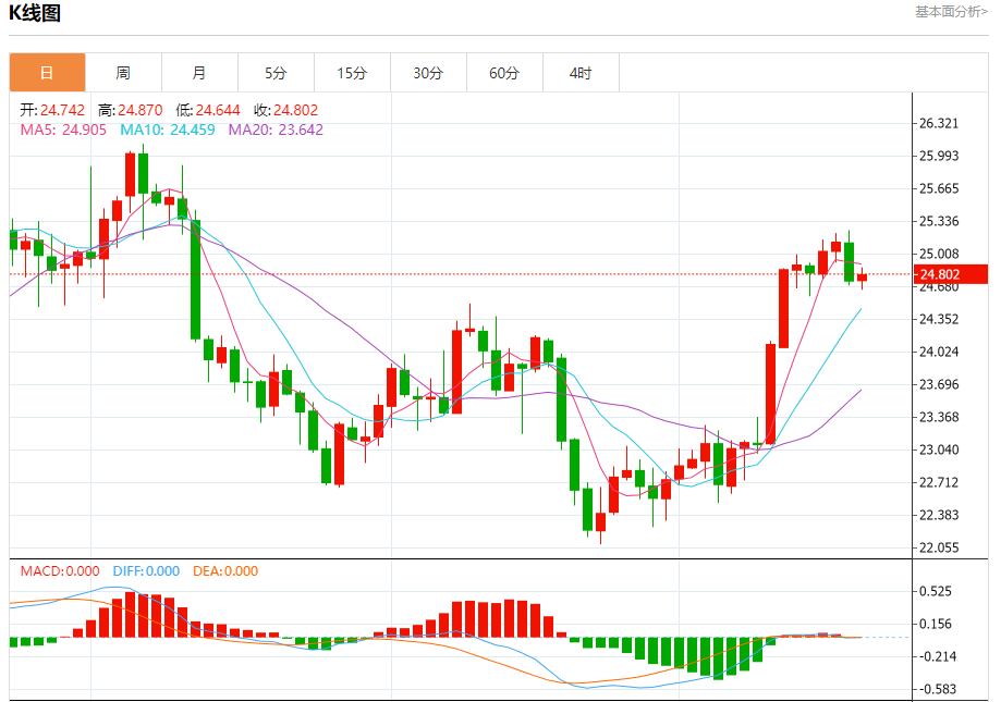 周五盘中,现货白银报24.860,涨幅0.50%。 今日分析:在24.88之下,看跌,目标价位为24.57,然后为24.28。 技术点评:RI技术指标看跌,有进一步下降空间。 支撑位:24.5724.2824.08 阻力位:25.2525.0724.88 (亚汇网编辑:冰凡)