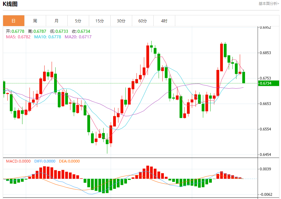 今日周五,澳元兑美元报0.6738,跌幅0.61%;美元兑加元报1.3208,涨幅0.30%;美元兑瑞郎报0.8650,跌幅0.20%。 澳元兑美元汇率分析 技术点评:RI技术指标向下运行。 阻力位:0.68200.68000.6785 支撑位:0.67300.67100.6695 美元兑加元汇率分析