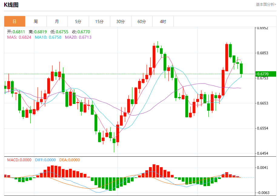 今日周三,澳元兑美元报0.6772,跌幅0.59%;美元兑加元报1.3178,涨幅0.06%;美元兑瑞郎报0.8579,涨幅0.06%。 澳元兑美元汇率分析 技术点评:RI技术指标向下运行。 阻力位:0.68500.68300.6800 支撑位:0.67450.67250.6705 美元兑加元汇率分析