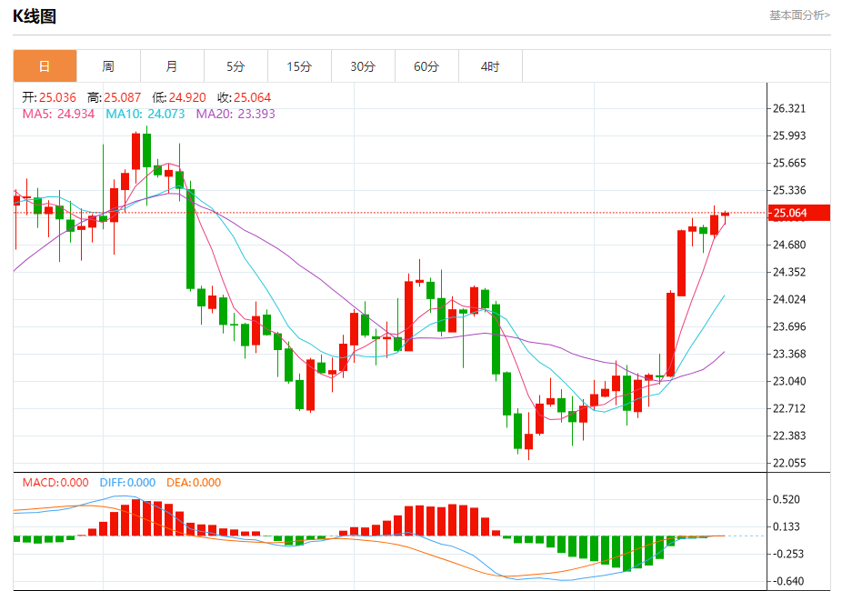 周三盘中,现货白银报25.102,涨幅0.26%。 今日分析:在24.82之上,看涨,目标价位为25.16,然后为25.32。 技术点评:RI技术指标看涨,有进一步上升空间。 支撑位:24.8224.6924.57 阻力位:25.5025.3225.16 (亚汇网编辑:冰凡)