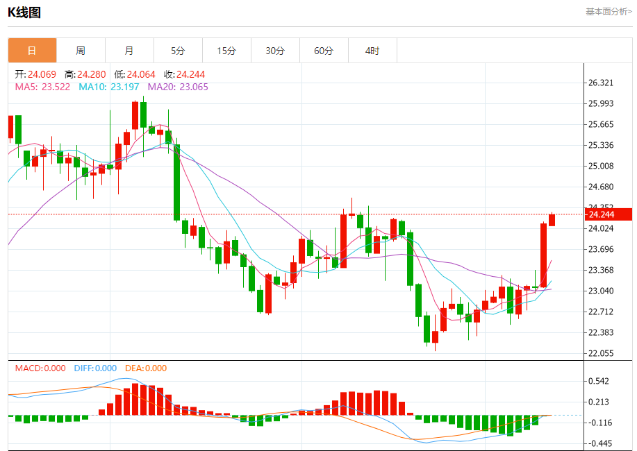 周四盘中,现货白银报24.258,涨幅0.66%。 今日分析:在23.85之上,看涨,目标价位为24.50,然后为24.70。 技术点评:RI技术指标缺乏下降动能 支撑位:23.8523.6023.38 阻力位:24.9024.7024.50 (亚汇网编辑:冰凡)