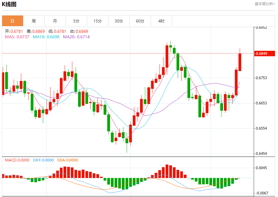 今日周四,澳元兑美元报0.6850,涨幅0.94%;美元兑加元报1.3165,跌幅0.17%;美元兑瑞郎报0.8639,跌幅0.37%。 澳元兑美元汇率分析 技术点评:RI技术指标向上运行。 阻力位:0.69100.68950.6880 支撑位:0.67950.67700.6740 美元兑加元汇率分析