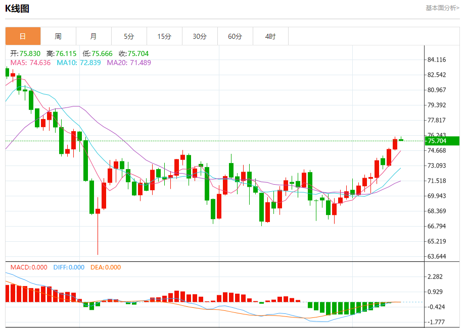 周四盘中,WTI原油报75.623,跌幅0.28%。 今日分析:在75.15之上,看涨,目标价位为76.80,然后为77.20。 技术点评:RI技术指标运行趋势复杂,倾向于上升。 支撑位:75.1574.6574.15 阻力位:77.7077.2076.80 (亚汇网编辑:冰凡)