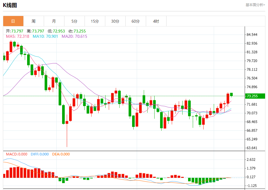周一盘中,WTI原油报73.174,跌幅0.63%。 今日分析:在72.70之上,看涨,目标价位为74.00,然后为74.40。 技术点评:即使我们不能排除持续调整的可能性,其时间长度上,应该是有限的。 支撑位:72.7072.2571.45 阻力位:75.1074.4074.00 (亚汇网