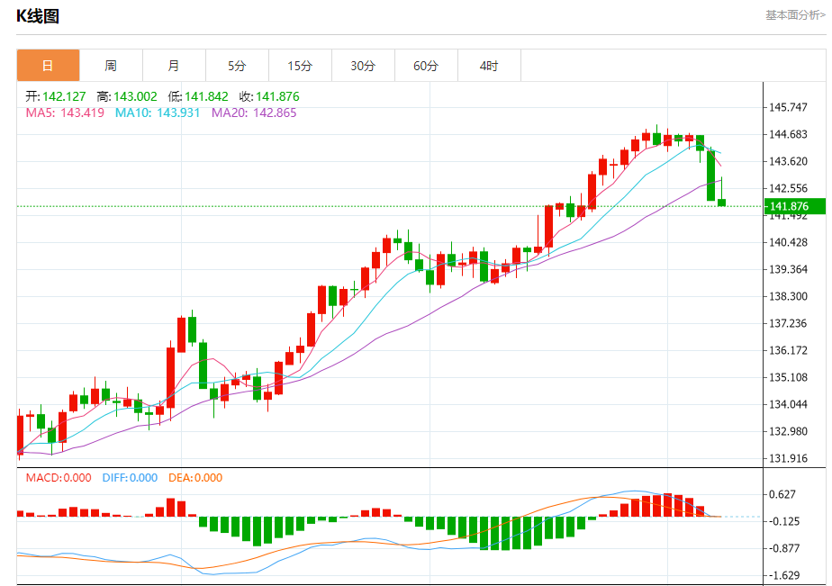 周一盘中,美元/日元报141.880,跌幅0.15%。 今日分析:在143.00之下,看跌,目标价位为142.05,然后为141.80。 技术点评:RI技术指标运行趋势复杂,倾向于下跌。 支撑位:142.05141.80141.60 阻力位:143.80143.40143.00 (亚汇网编辑:冰凡)