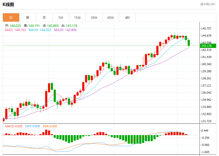 今日周五,截止目前美元兑日元报143.172,下跌0.62%。 日元基本面行情分析 前日本财务副大臣神原英姿表示,由于日本与美国的货币政策分歧不断扩大,日元可能跌至超过去年触及的30多年低点。他说,随着日本央行坚持超宽松政策,而美联储提高利率以抑制通胀,日元可能会在当前水平上贬值10%