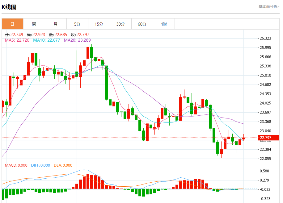 周一盘中,现货白银报22.858,涨幅0.51%。 今日分析:在22.63之上,看涨,目标价位为22.96,然后为23.09。 技术点评:RI技术指标运行趋势复杂,倾向于上涨。 支撑位:22.6322.5222.35 阻力位:23.2523.0922.96 (亚汇网编辑:冰凡)