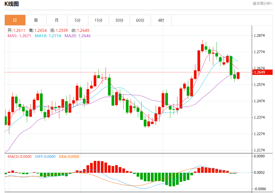 周五盘中,英镑/美元报1.2651,涨幅0.30%。 今日分析:在1.2610之上,看涨,目标价位为1.2665,然后为1.2690。 技术点评:RI技术指标看涨,有进一步上升空间。 支撑位:1.26101.25901.2570 阻力位:1.27151.26901.2665 (亚汇网编辑:冰凡)