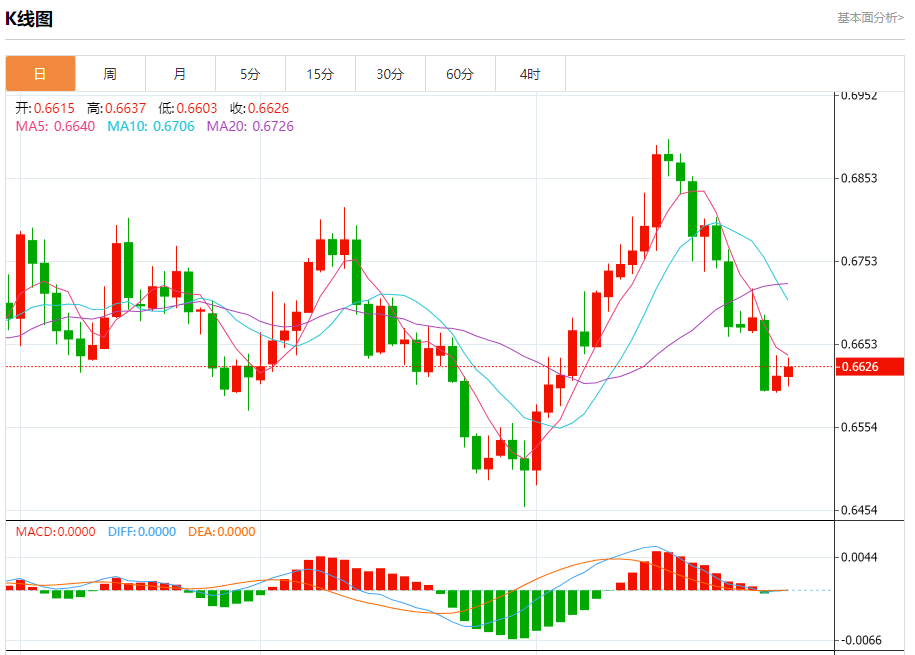 今日周五,澳元兑美元报0.6628,涨幅0.17%;美元兑加元报1.3268,涨幅0.11%;美元兑瑞郎报0.9005,涨幅0.13%。 澳元兑美元汇率分析 技术点评:0.6600附近形成了一个支撑的底部,将带来走势短期内的稳定。 阻力位:0.66800.66650.6650 支撑位:0.66000.65800.656