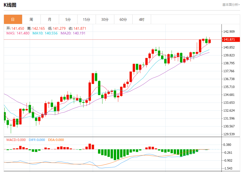 周三盘中,美元/日元报141.869,涨幅0.29%。 今日分析:在141.70之上,看涨,目标价位为142.20,然后为142.50。 技术点评:RI技术指标看涨,有进一步向上趋势。 支撑位:141.70141.50141.20 阻力位:142.80142.50142.20 (亚汇网编辑:冰凡)