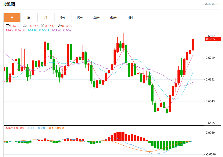 今日周二,澳元兑美元报0.6796,涨幅0.68%;美元兑加元报1.3333,跌幅0.27%;美元兑瑞郎报0.9052,跌幅0.43%。 澳元兑美元汇率分析 技术点评:RI技术指标向上运行。 阻力位:0.68350.68200.6800 支撑位:0.67550.67350.6715 美元兑加元汇率分析