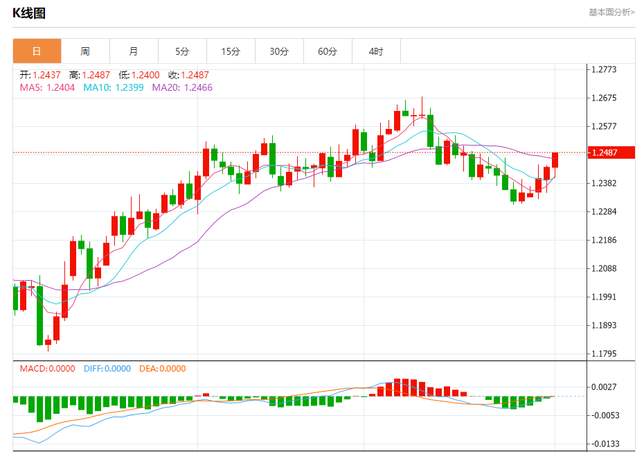 周四盘中,英镑/美元报1.2486,涨幅0.39%。 今日分析:在1.2400之上,看涨,目标价位为1.2500,然后为1.2530。 技术点评:RI技术指标向上运行。 支撑位:1.24001.23751.2345 阻力位:1.25451.25301.2500 (亚汇网编辑:冰凡)