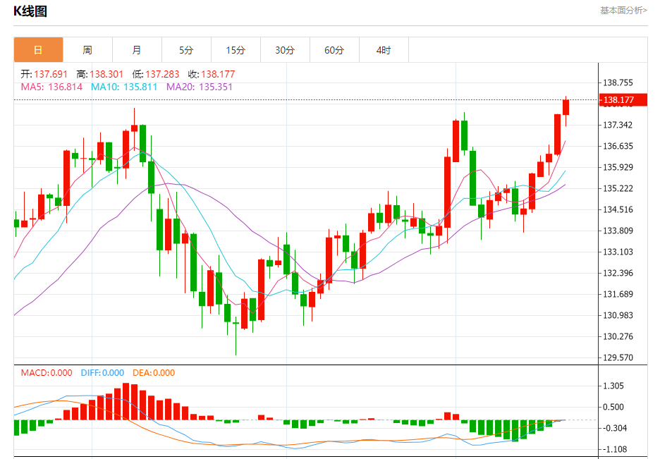 周四盘中,美元/日元报138.192,涨幅0.40%。 今日分析:在137.25之上,看涨,目标价位为138.20,然后为138.50。 技术点评:RI技术指标向上运行。 支撑位:137.25136.70136.25 阻力位:138.85138.50138.20 (亚汇网编辑:冰凡)
