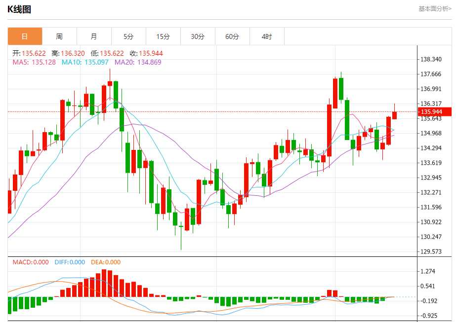 周一盘中,美元/日元报136.063,涨幅0.25%。 今日分析:在135.40之上,看涨,目标价位为136.60,然后为137.00。 技术点评:RI技术指标运行趋势复杂,倾向于上涨。 支撑位:135.40135.10134.70 阻力位:137.30137.00136.60 (亚汇网编辑:冰凡)