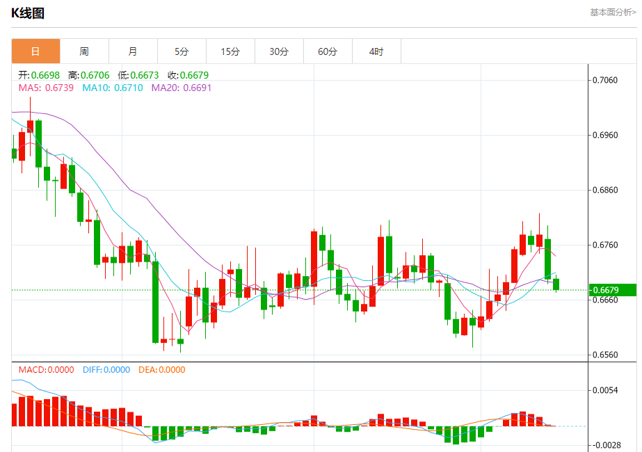 今日周五,澳元兑美元报0.6685,跌幅0.22%;美元兑加元报1.3488,跌幅0.02%;美元兑瑞郎报0.8931,跌幅0.13%。 澳元兑美元汇率分析 技术点评:RI技术指标运行趋势复杂,倾向于下跌。 阻力位:0.67550.67350.6715 支撑位:0.66800.66600.6640 美元