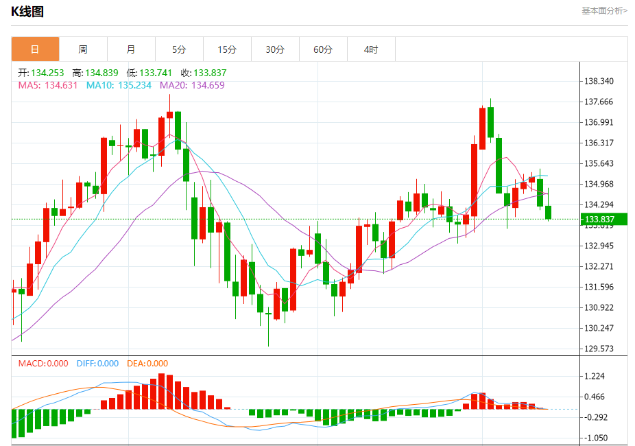 周四盘中,美元/日元报133.820,跌幅0.33%。 今日分析:在134.80之下,看跌,目标价位为133.80,然后为133.35。 技术点评:RI技术指标运行趋势复杂,倾向于下跌。 支撑位:133.80133.35133.00 阻力位:135.45135.05134.80 (亚汇网编辑:冰凡)