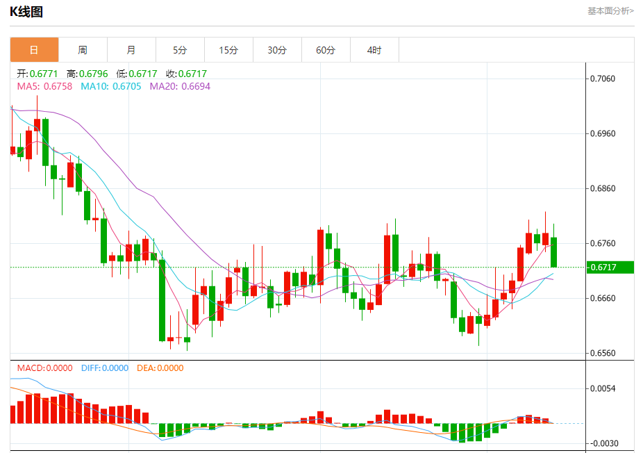 今日周四,澳元兑美元报0.6718,跌幅0.91%;美元兑加元报1.3457,涨幅0.67%;美元兑瑞郎报0.8925,涨幅0.32%。 澳元兑美元汇率分析 技术点评:RI技术指标向下运行。 阻力位:0.67950.67800.6760 支撑位:0.67150.66900.6675 美元兑加元汇率分析