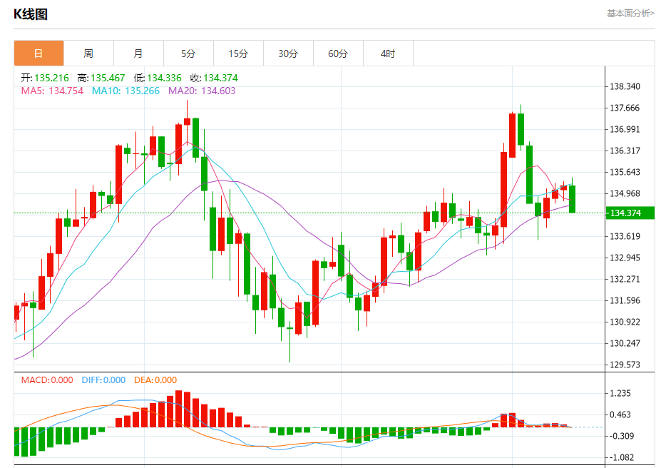 周三盘中,美元/日元报134.386,跌幅0.62%。 今日分析:在135.05之上,看涨,目标价位为135.45,然后为135.60。 技术点评:RI技术指标运行趋势复杂,倾向于上涨。 支撑位:135.05134.90134.70 阻力位:135.80135.60135.45 (亚汇网编辑:冰凡)