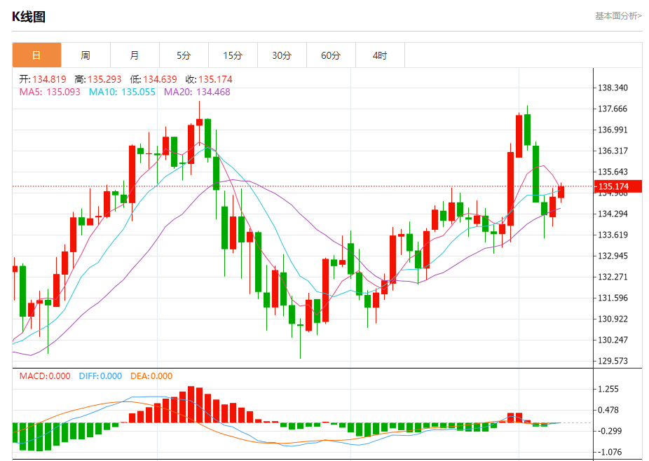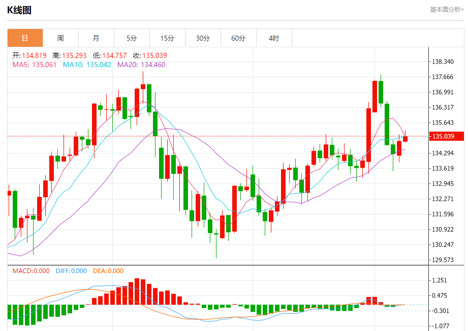 周一盘中,美元/日元报135.048,涨幅0.16%。 今日分析:在134.50之上,看涨,目标价位为135.30,然后为135.60。 技术点评:RI技术指标向上运行。 支撑位:134.50134.20133.85 阻力位:135.85135.60135.30 (亚汇网编辑:冰凡)