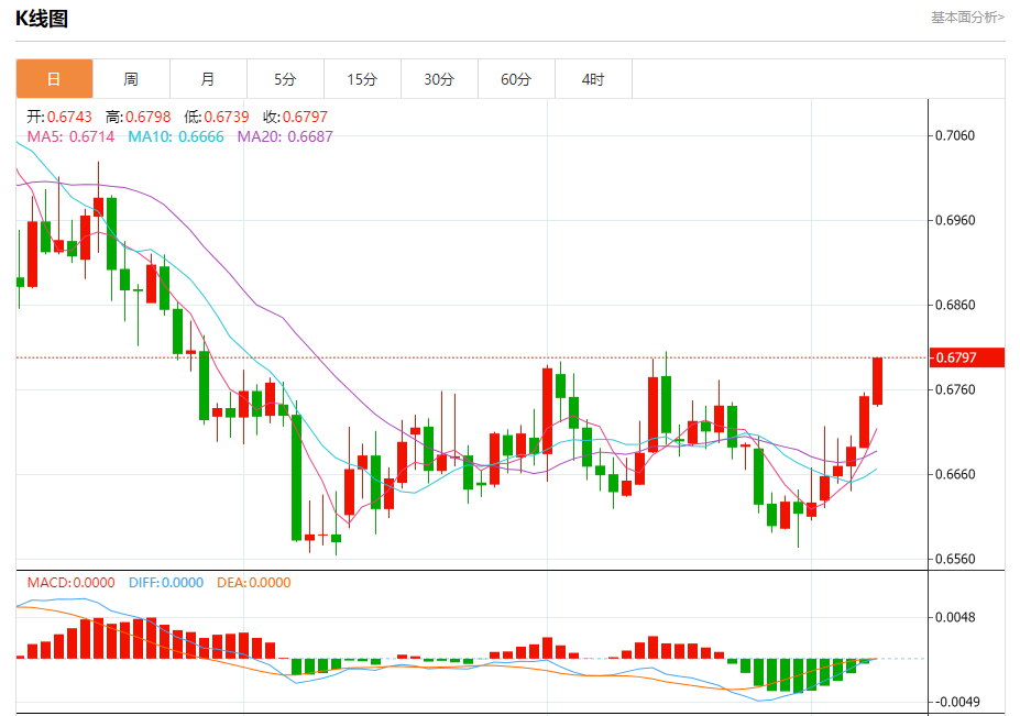 今日周一,澳元兑美元报0.6798,涨幅0.66%;美元兑加元报1.3320,跌幅0.41%;美元兑瑞郎报0.8890,跌幅0.18%。 澳元兑美元汇率分析 技术点评:RI技术指标看涨,有进一步向上趋势。 阻力位:0.68400.68250.6810 支撑位:0.67550.67350.6705 美元兑
