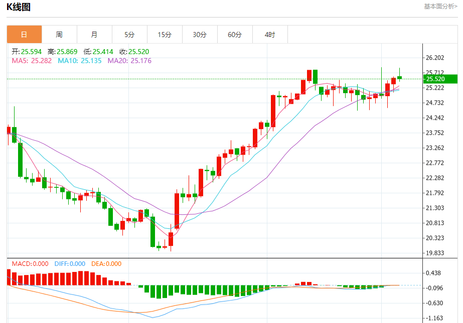 周四盘中,现货白银报25.512,跌幅0.33%。 今日分析:在25.45之上,看涨,目标价位为25.90,然后为26.10。 技术点评:RI技术指标看涨,有进一步上升空间。 支撑位:25.4525.3025.10 阻力位:26.3026.1025.90 (亚汇网编辑:冰凡)