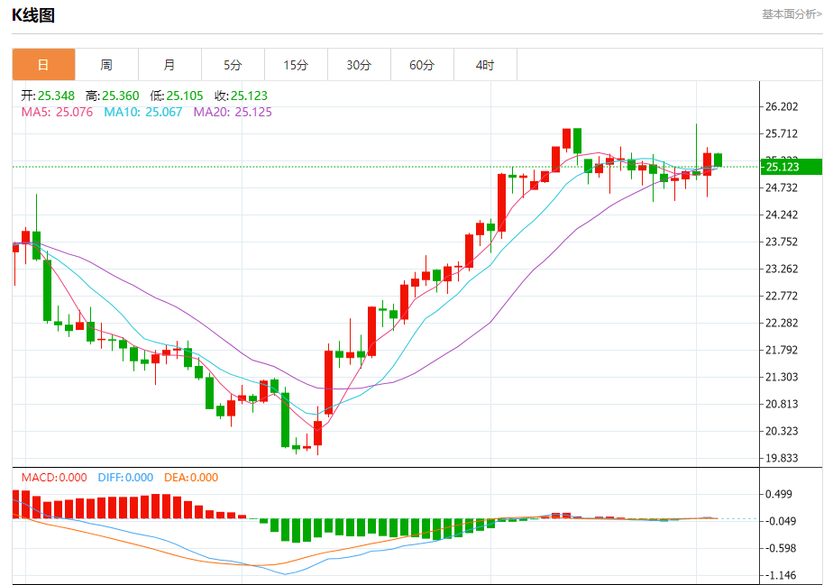 周三盘中,现货白银报25.138,跌幅0.86%。 今日分析:在25.05之上,看涨,目标价位为25.48,然后为25.65。 技术点评:在25.05之上,为多头信号,向上的目标位为25.48。 支撑位:25.0524.8024.60 阻力位:25.9025.6525.48 (亚汇网编辑:冰凡)