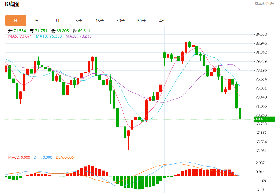 周三盘中,WTI原油报69.490,跌幅2.86%。 今日分析:在71.00之下,看跌,目标价位为68.80,然后为67.50。 技术点评:RI技术指标看跌,有进一步下降空间。 支撑位:68.8067.5067.00 阻力位:73.0071.8071.00 (亚汇网编辑:冰凡)