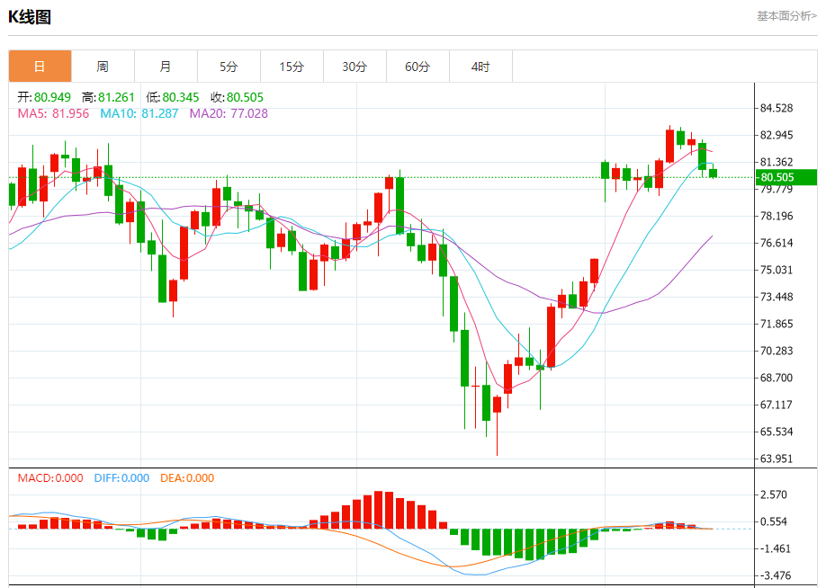 周二盘中,WTI原油报80.584,跌幅0.44%。 今日分析:在80.95之下,看跌,目标价位为79.80,然后为79.40。 技术点评:跌破80.95,为空头信号,向下的目标将会是79.80。 支撑位:79.8079.4079.00 阻力位:81.6081.3080.95 (亚汇网编辑:冰凡)