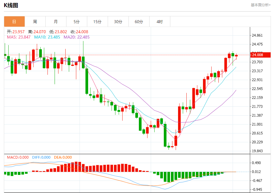 周二盘中,现货白银报24.000,涨幅0.20%。 今日分析:在23.79之上,看涨,目标价位为24.18,然后为24.30。 技术点评:23.79附近形成了一个支撑的底部,将带来走势短期内的稳定。 支撑位:23.7923.6523.55 阻力位:24.5024.3024.18 (亚汇网编辑: