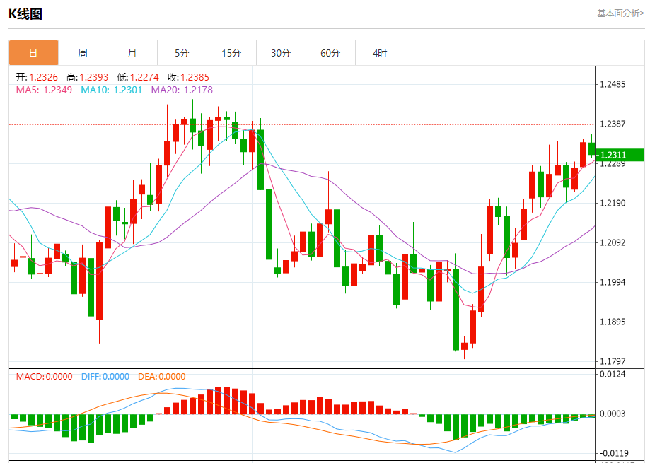 周一盘中,英镑/美元报1.2387,涨幅0.45%。 今日分析:在1.2305之上,看涨,目标价位为1.2390,然后为1.2420。 技术点评:RI技术指标向上运行。 支撑位:1.23051.22701.2240 阻力位:1.24451.24201.2390 (亚汇网编辑:冰凡)